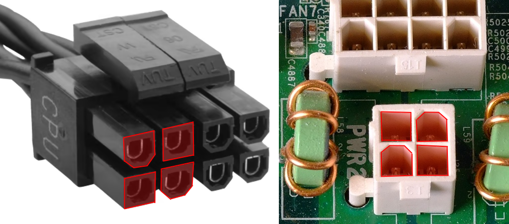 手順 5. においてケーブル側の 8pin (オス) を マザーボード側の 4pin (メス) に接続してよいのか迷うが、下記のように接続部が合うようになっているので、安心して接続すればよい。